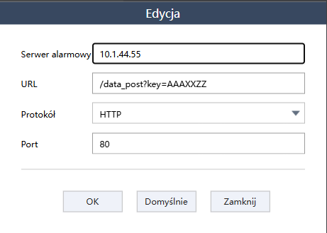 Po wygenerowaniu danych przejdź do rejestratora do sekcji Centrum alarmowe uruchom edycje endpintu HTTP oraz wprowadź następujące informacje