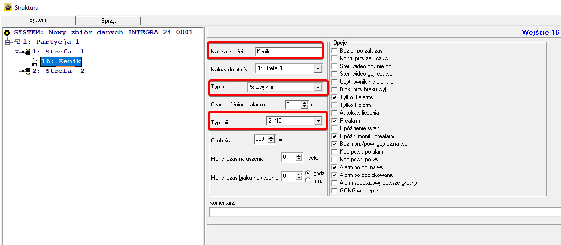 Skonfiguruj dla wybranej strefy jedno z wejść alarmowych nadając unikalną nazwę, typ reakcji oraz typ linii