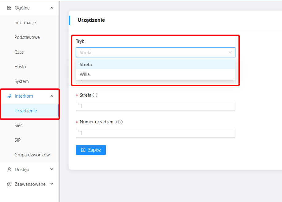 W celu konfiguracji stacji zewnętrznej KG-S21KRB-N w trybie wielolokatorskim, tj. z możliwością dzwonienia do większej liczby paneli wewnętrznych przy użyciu szyfratora, zaloguj się do interfejsu WWW urządzenia, a następnie przejdź do Interkom -> Urządzenie. W trybie działania urządzenia zmień stan z Willa na Strefa.