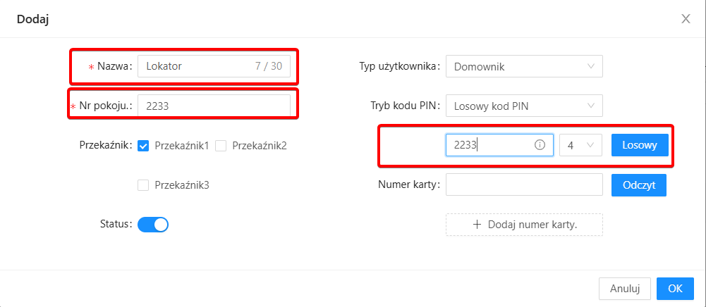 „Po zapisaniu ustawień przejdź do zakładki Dostęp -> Osoba, a następnie dodaj nową pozycję, wprowadzając unikalną nazwę lokalu, nr pokoju skonfigurowany w panelu wewnętrznym oraz kod otwarcia drzwi z szyfratora.